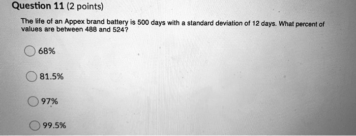 Solved Question 11 2 Points The Life Of An Appex Brand Battery Is 500 Days With Standard Deviation Of 12 Days What Percent Of Values Are Between 488 And 524 68 81 5 97 99 5